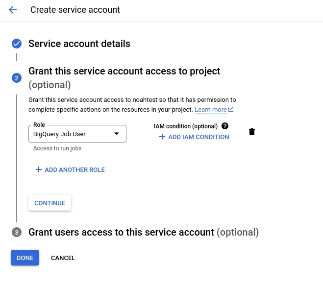Select the BigQuery Job User role. This will allow Datawisp to run queries in your BigQuery account.