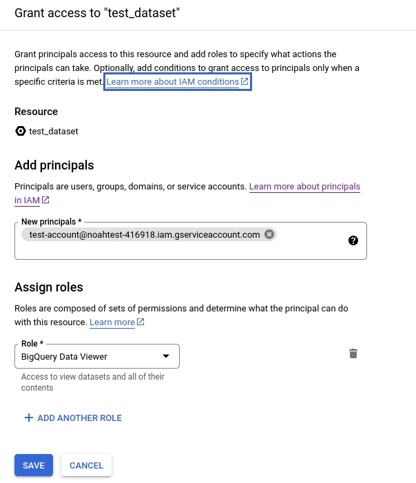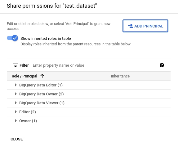 Alternatively, you may choose to grant this role only on specific tables inside the dataset. In that case, you still need to grant the BigQuery Metadata Viewer role on the on the dataset. This will allow Datawisp to list (but not query) all tables in the dataset and is needed so that Datawisp can find the tables that it was granted access to.